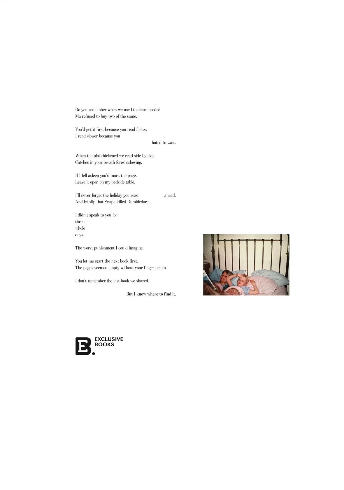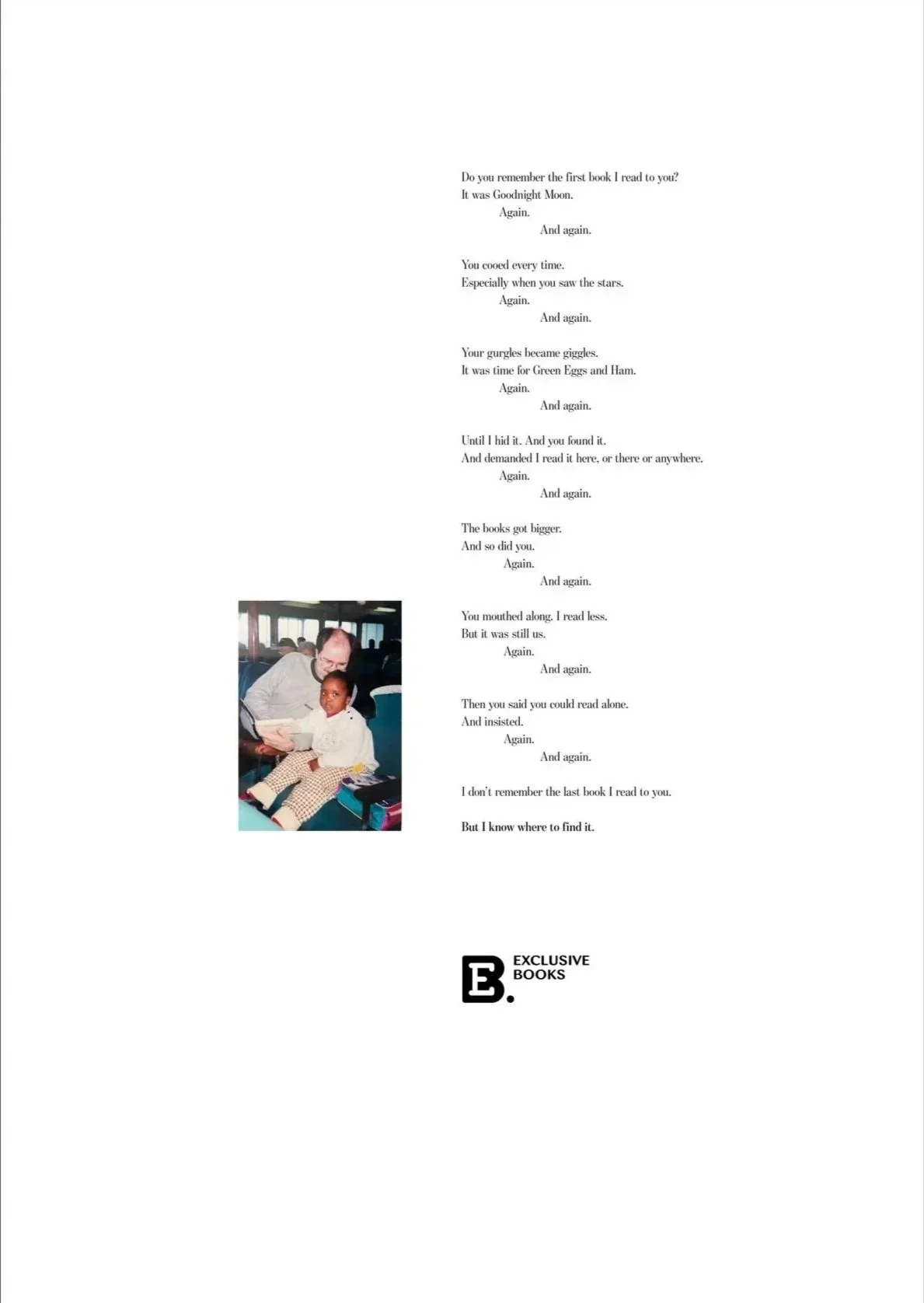 That conversation became these poems, which went on to become these print ads after I shared them with my CD, Jo. Because even though I can’t go back to those nights with my ma, there is a place where I can find all the stories we read.